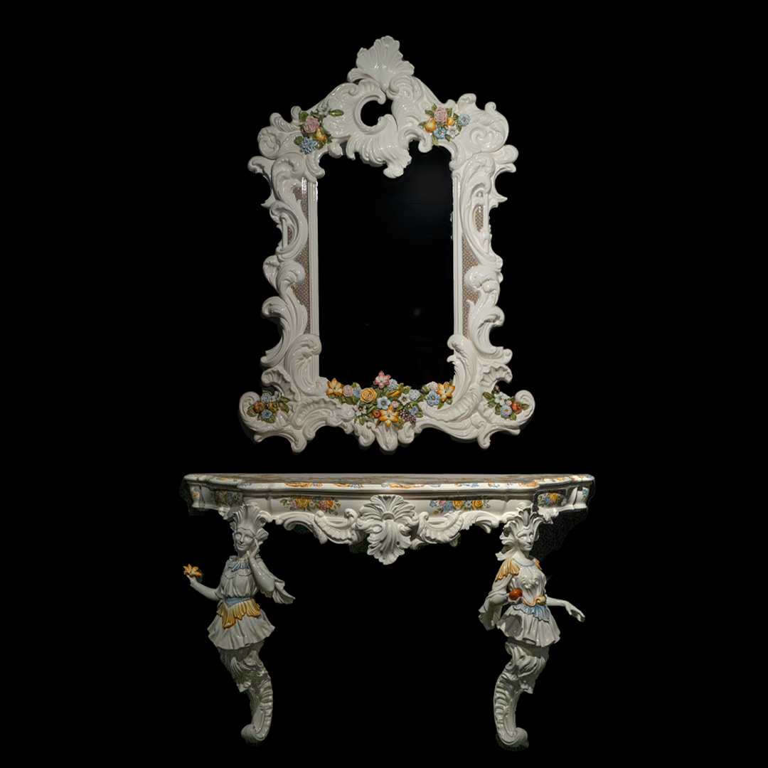 En la parte superior se encuentra un espejo, cuyo marco está formado por rocalla motivos florales y frutales.